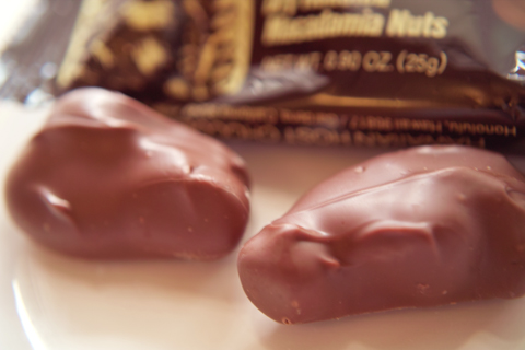 1個のチョコレートに二粒のマカデミアナッツが入っています。とても一口で食べられる大きさじゃないから、二口分おいしい。カリッとローストされたマカデミアナッツにたっぷりのチョコレートがからめてあります。チョコレートは癖のない新鮮なミルクの香り。ナッツだけじゃなくて、チョコレートもおいしく、とても食べやすいのが人気の秘密です。