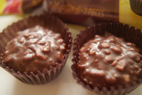 中にはパラフィンカップに包まれた二粒のクランチチョコレートが入っています。商品説明によると「クラッシュしたハワイ産マカデミアナッツとライスクリスプをオリジナルミルクチョコレートにミックスしました。」
