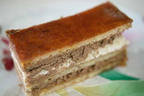 一番上のカリっと焼き上げたビスキュイ・ジョコンド(アーモンドパウダーで作ったスポンジ)がとってもリッチな風味。ほんのり苦いカラメルの味がクレームブリュレの焦がし香と同じ。みんなに愛される香りです。福砂屋のカステラの底にあるザラメ糖を思い出します。