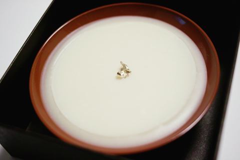中には赤い漆塗りの器に入ったホワイトチョコレートが入っています。金箔が飾られて、とても日本的な雰囲気が漂います。