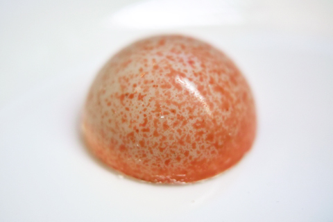 日本酒キャラメルガナッシュは朱色のグラデーションが桜吹雪のようなドーム型のチョコレートです。今年のテーマ「ジャポン」のために作ったもので、日本酒「鬼ごろし」をキャラメルガナッシュに加えたチョコレートです。コーティングはホワイトチョコレートです。