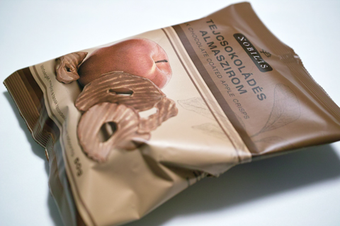 今回は、アップルチップス・ミルクチョコレートコート(NOBILIS TEJCSOKOLÁDÉS ALMASZIROM)です。茶色を基調にしたパッケージにはリンゴと内容物のイラストがわかりやすく描かれています。