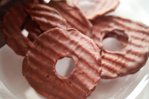中身はドライアップルのギザギザチップスにバリー・カレボー社製のミルクチョコレートでコーティングしたものです。