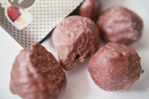一口サイズで歪な丸い形。見た目はさほどよくありません。「熟成ワインで漬けたいちじくをビターチョコでくる」んでいます。