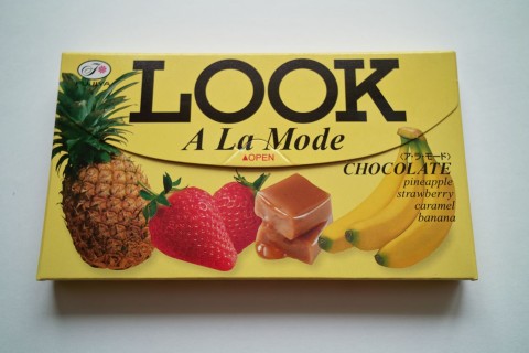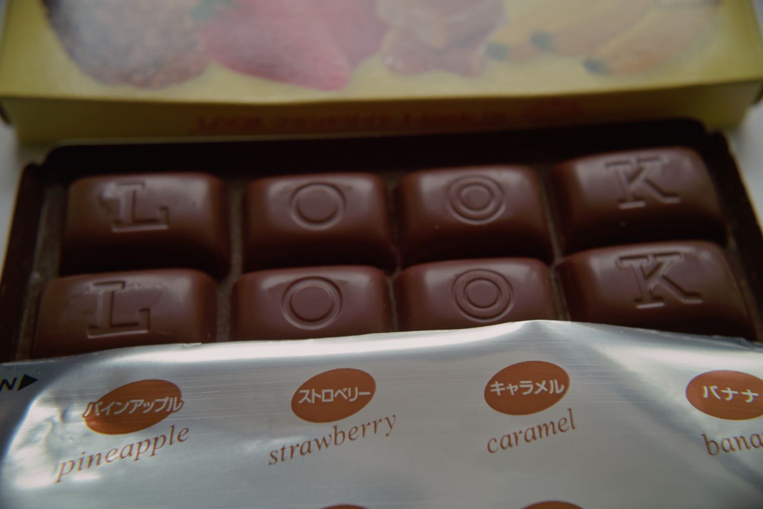 原材料:砂糖、植物油脂、全粉乳、カカオマス、ココアバター、キャラメルソース(乳を含む)、バナナソース、パインアップルソース、ストロベリーソース、乳糖、脱脂粉乳、酒精飲料、乳化剤(大豆由来)、香料(乳由来)、酸味料、着色料(紅麹、カロチノイド、カラメル、紅花黄)