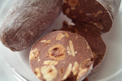中身はもちろんチョコレート。表面が白いのは砂糖がまぶされているからです。断面を見るとナッツがたっぷり入っているのがわかります。「サラミをスライスした時にみられる霜降り脂の模様を、ヘーゼルナッツとアーモンドで表現」したのだそうです。