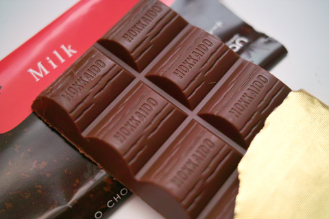北海道チョコレート ミルクは半分に切った丸太のような形のブロックを並べた6×2のチョコレートバーです。それぞれのブロックにはHOKKAIDOのロゴが入っています。商品説明によると「北海道産練乳パウダーをブレンドしてリッチな味わいのミルクチョコレートに仕上げ」てあるそうです。