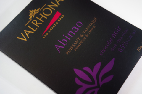 しっかりした苦味のあるタブレットを食べたくて、広尾駅の近くにある明治屋に買いに行きました。グラン・クリュのタブレット アビナオ(Abinao)です。パッケージに描かれているのはカカオの花のモチーフです。ヴァローナのロゴでもあります。