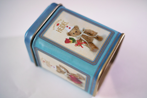 スイートベア缶(Siiße Choco-Griiße)は手のひらに収まるようなサイズの小さな缶に入ったチョコレートです。チューリップの花を手にしたテディベアの写真がついています。