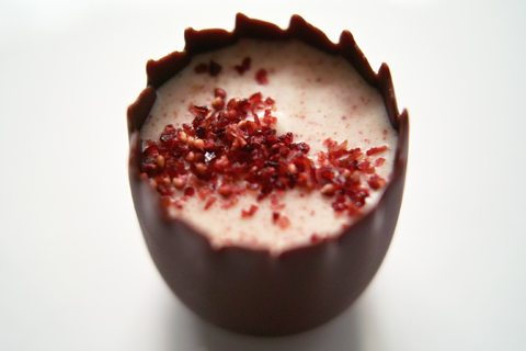 パルフェフレーズ(Parfait Fraise)は「ショートブレッドをアクセントにした、ホワイトチョコレートとストロベリーで挟んだストロベリーのコンフィ仕立てを、ダークチョコレートのカップで包」んであります。