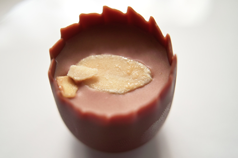 洋梨の甘酸っぱさとミルクチョコレートのまろやかさが実に上品に混ざり合います。とてもバランスの良い味。塩味の利いたアーモンドのプラリネが余韻の最後までミネラルの旨みを演出します。フルーティでまろやかです。