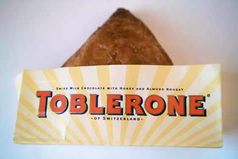 トブラローネ(TOBLERONE)といえば、マッターホルンをイメージして作られた三角形のチョコレートですが、ナチュラルローソンのベーカリーコーナーに並んでいたのは、紛れもなくトブラローネのパッケージをまとったデニッシュでした。