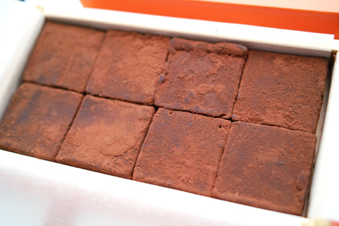 明るいオレンジ色のパッケージでリボンがついています。撮影のために外しましたが、箱ごとクリアなビニールに包まれて販売されています。そのため、商品の品質がやや長めに保持されるかもしれません。生チョコレートにしては珍しく賞味期限が21日もあります。生チョコレートの多くは1週間から長くて2週間でしょうか。