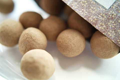 中身はココアパウダーをたっぷりまとったチョコボールです。商品説明によると「昔懐かしいさくさく卵ボーロに、ほろ苦さと優しい甘さが口いっぱいに広がります。静岡のほうじ茶とショコラの運命的な出会い…。日本の味覚を凝縮した和すぃーつ」だそうです。