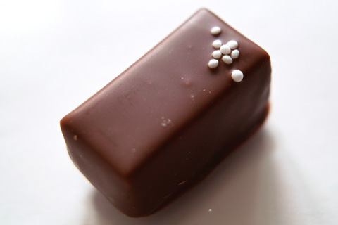 ジャンドゥーヤはミルクチョコレートのコーティングで角に白い粒のトッピングがあります。