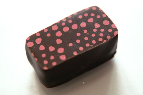 ラズベリーガナッシュはピンクの模様が入ったビターチョコレートのコーティング。