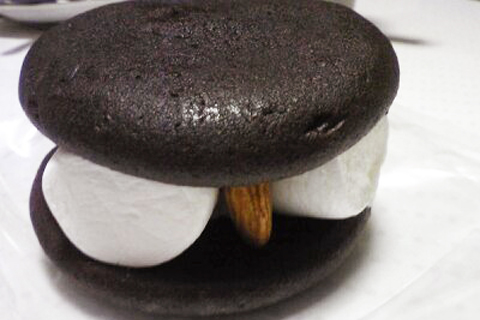 ウーピーパイは、アメリカンTVドラマ、セックス・アンド・ザ・シティでブームに火がついたスイーツ。元々は、アメリカ東部のニューイングランド地方やペンシルバニアのアーミッシュたちの間で食べられてきた伝統的なお菓子だそうです。ふんわり柔らかいココアクッキーにマシュマロとアーモンドがサンドされています。日本でいったら森永エンゼルパイです。
