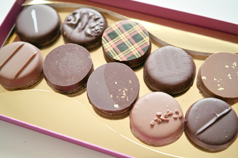 中には個性的な表情をした10種類の円盤状のボンボンショコラが入っています。左上からエクアドルシトロン、ユズ、ペーシュフランボワーズ、タタン、パンプルムース、右下に移ってグラッパマスカット、ガーナ、マダカスカル、アマンド、ノワゼットです。