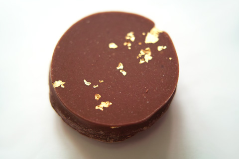パンプルムースとはフランス語でグレープフルーツのこと。センターのミルクチョコレートガナッシュにグレープフルーツの香りを閉じ込めてあります。ミルクのまろやかさの中から、グレープフルーツのやさしい苦味と瑞々しい青い酸味が顔を覗かせます。他のものと比べると少し甘めにしてありますが、水野氏らしい、すっきりとした味わいに仕上がっています。金箔のイメージはないのだけれど。