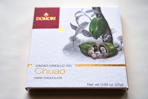 チュアオ(CACAO CHUAO)70%カカオです。パッケージは白を基調にした正方形の箱で、緑色のカカオが描かれています。前のと比べて、ずいぶんとナチュラルなテイストになりました。