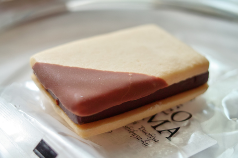 夏チョコの商品説明によると「風味豊かな濃厚チョコを、サクサクのクッキーでサンド。キンキンに冷えているのに、チョコはとろーり、なめらか」だそうです。