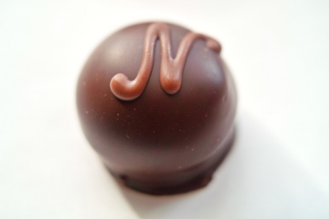 マノン ノワール(MANON NOIR)はNの文字が飾られた丸いビターチョコレートのボンボンショコラ。とてもかわいらしいフォルム。商品説明によると「ダークチョコレートの中はなめらかなチョコレートムース。<秋冬限定>」だそうです。