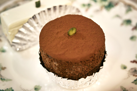 ガナッシュはこぶりな丸いケーキ。表面にチョコレートパウダーがたっぷりとふりかけられていて、ピスタチオがアクセントに飾られています。ちなみに、レアチーズケーキも同じようにピスタチオが飾られているので、二種類を並べると丸いのと四角いので対象的なコンビみたい。