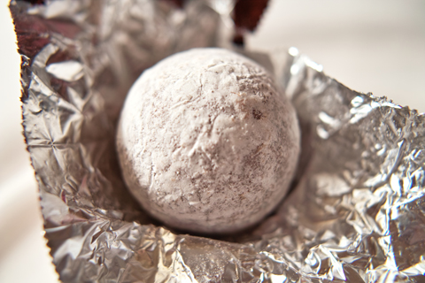トリュフ・モンブラン(Truffe mon-blanc)はブラウンの銀紙に包まれています。中はパウダーシュガーがたっぷりとまぶされたトリュフ。商品説明によると「キャラメルソースを使った口当たりのよいガナッシュ入り」のチョコレートです。