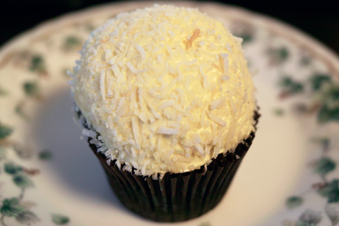 マンゴーココナッツ(Mango Coconut)です。表面にココナッツをたっぷりとまとったチョコレートベースのカップケーキです。