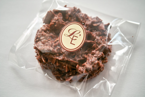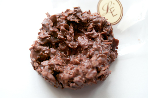 カカオの風味が鮮明なミルクチョコレートで甘さは控えめですが、クッキーがほんのり甘くてちょうどいい。細かくて薄いクッキーはサクサクと軽い歯応え。それに、たっぷりからまったチョコレートの弾力があわさって食べ応えがあります。後味にフローラルな甘い香りがします。