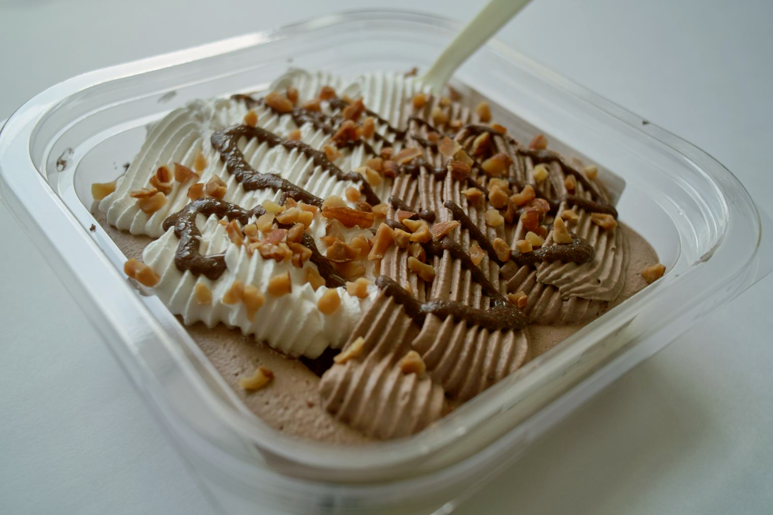 大きいだけで不味いものを想像していたんですが、食べてみると意外にさっぱり。二色クリームの下は軽い食感のココアスポンジ、さらにその下にカスタードクリームが敷いてあります。食べる前は一気に食べるのは無理だろうなって思ってましたが、結局食べきっちゃいました。