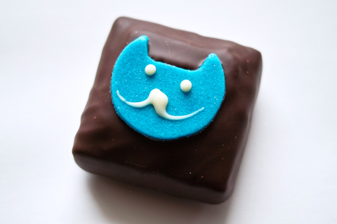 中にはボンボンショコラとは言いがたい大きさのダークチョコレート。縦横4.5センチの正方形でやや厚みがあり、表面に青い猫が描かれています。上記でリンクしたフェイスブックページを見てもらうとわかるとおり、ブランドイメージの青い猫は古めかしくてとてもかわいいとは言えないキャラクターですが、チョコレートの方はおしゃれです。