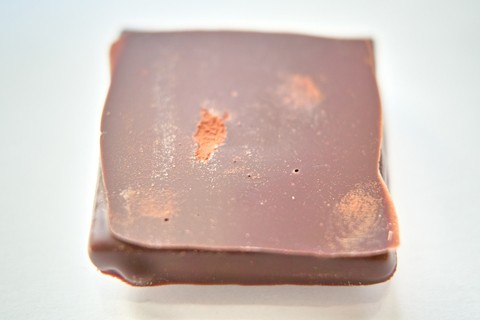 平たい形のボンボンショコラです。口に入れた時に赤色カカオのパウダーが舌の味覚を少し鈍らせカカオの渋みを感じます。その後に甘さと、フルーツのようなピリッと舌を刺激する甘酸っぱい味、キャラメルのような濃厚でまろやかな香り、カシューナッツのような脂の香りがします。ガナッシュが溶けた後も長くチョコレートの味を楽しめます。上側(口蓋側)のコーティングが厚めになっているところに秘密がありそう。うまくできています。