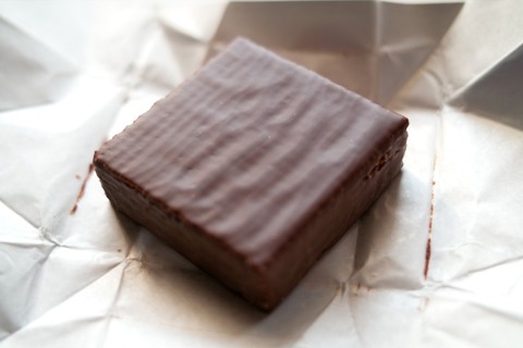 ヴィエネッズィ バニラ(Viennesi – WAFFER COVERED WITH DARK CHOCOLATE -)はウエハースをビターチョコレートでコーティングしたものです。商品説明によると「きめの細かいクリームサンド・ウエハースとそれを包む重厚なチョコレートとのハーモニー。ヨーロッパのスイーツ・ファンも認める長年の人気商品」だそうです。