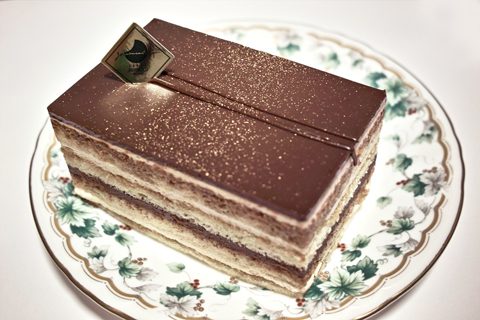 とても大きなケーキです。グラサージュはつややかで表面に二筋のライン。そして、金箔が降り掛けてあります。ブランドマーク入りの金色のケーキピックが刺さっています。