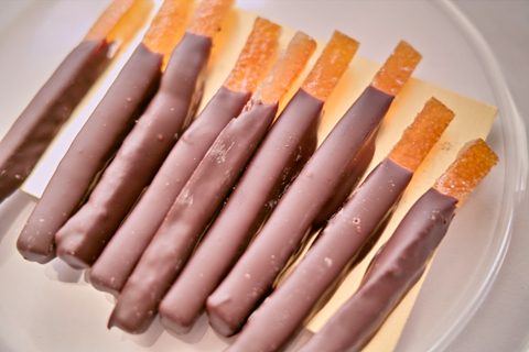 指でつまみやすく、食べやすいサイズです。オレンジピールはしっかりとした噛み応え。柑橘類に特有の苦味と清涼感が、チョコレートの苦味とよく合います。食べ終わり、舌に残るぴりぴりとした苦味までおいしいです。