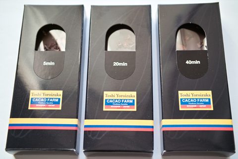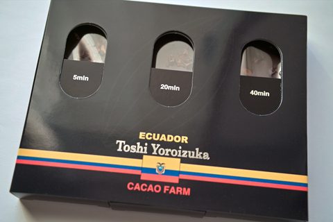 今回は、2014年秋に収穫したカカオ豆を空輸してまいりました。それを3つ、5分・10分・15分とロースト時間の違いで味を変えております。皆さんが普段召し上がっているチョコレートは、大体20分以上のローストで、カカオには本来焙煎の風味はありません。本来はフローラルでフルーティ、さらに発酵させているため酸味があります。せっかく栽培から始めたので、そういった風味をストレートに伝えようとこの低ローストのショコラを作りました。初めて食べた方はきっと驚かれるかと思いますが、これこそが世界で一番エクアドルのカカオに近いものであると自負しております。是非3種の味の違いを堪能していただきたいと思います。非常に個性的ではありますが、自信を持ってお届けします。
