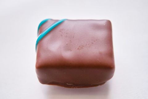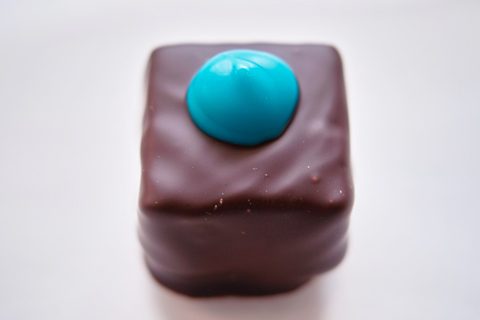 ミニ・シャ・ブルーはビターチョコレートでコーティングしたボンボンショコラで青く丸い膨らみが目印。商品説明によると「ザクザクとした食感のヌガティーヌの上にプラリネをのせてチョコレートでコーティングした」ものだそうです。