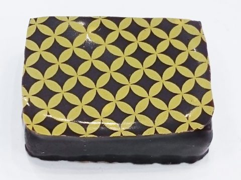 ユズ・バジリック(Yuzu Basilic)です。商品説明によると「ユズの酸味とバジルの苦み(青さ)をあわせ、バジルの独特の風味をたたせました。天面には、末広がりを意味する日本の伝統文様“青海波”をあしらい、ブルターニュと日本の繋がりを表現し」たそうです。