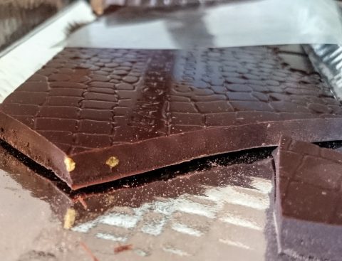中のチョコレートにもワニ革の模様が入っています。カカオ分62%、ビーポーレン、つまりミツバチの集めた花粉だんご入りのタブレットです。