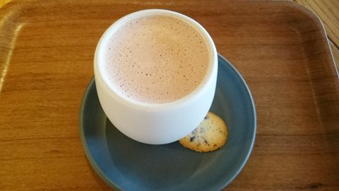 抹茶入りのホットチョコレートです。泡立てているので、口当たりがとても柔らかくて飲みやすい。お茶の旨味も感じられて、大変センスがよいと思います。日常的に飲むなら、これくらいがぴったりです。この器は、やや持ちにくいのですが、寒い日に両手を温めるにはもってこいです。器に添えられたチョコチップ入りのフィナンシェはサクサクで、バターの香りがおいしかった。