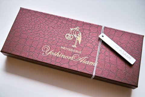 ヨシノリ・アサミ;ショコラ アソート 12個入りを買いました。クロコダイル皮模様の茶色の化粧箱で、金色でブランドロゴとトレードマークのコウノトリが描かれています。ブランド名が入った銀色タグが飾られていて、高級感のあるデザインです。