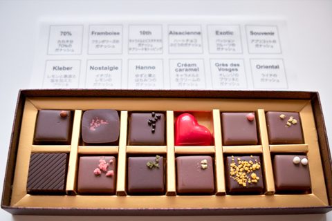 中には12種類の美しいボンボンショコラが入っています。上段左から70%、フランボワーズ、10th、アルザシエンヌ、エキゾチック、スーベニア、下段左からクレベール、ノスタルジー、ハンノ、クレーム・キャラメル、グレ・デ・ヴォージュ、オリエンタルです。