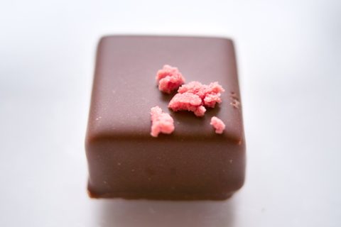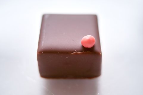 ピンク色のトッピングが珊瑚のようで愛らしい。センターはパッションフルーツの優しい酸味が詰まったミルクチョコレートのガナッシュ。滑らかな口溶けと、どこまでも続く甘い香りがたまりません。こんなスイートな見た目でパッションフルーツ風味というギャップにやられます。後味もずっと華やかに続きます。