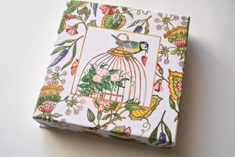 サロン・デュ・ショコラでショコラ アソート フルール エ サヴール ドゥ ロランジェ(9個入)を買いました。たくさんの花々が描かれた化粧箱で、中央に、朝顔が絡まる金色の鳥かごに止まる小鳥が描かれています。こちらは、フェルベール氏の友人でアーティストのギイ氏が手がけているそうです。