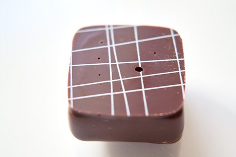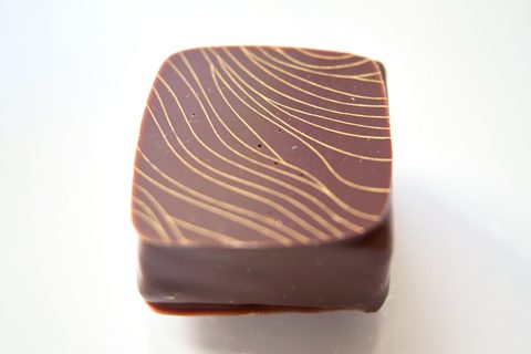 コーティングはビターチョコレート、センターはハチミツ入りのガナッシュです。ビターチョコレートの乾いた苦味の後に、フローラルなハチミツの香り、滑らかな口溶けを感じていると、ふいにオレンジの香りが立ち上がります。余韻に軽くオレンジの香りが残って、おいしい。