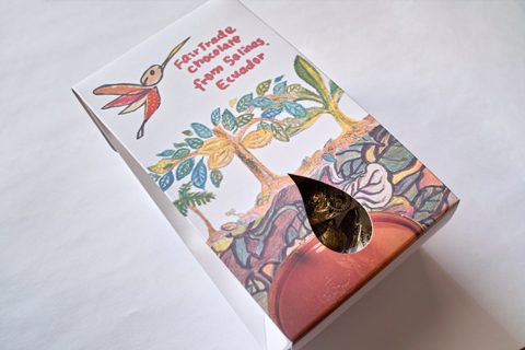 スローウォーターカフェのチョコレートはエクアドルのボリバル州サリナス村で作られています。チョコレート工場の技術をスイスから導入し、近隣の村で収穫された高品質なカカオをトラックで運搬し、カカオを焼き、溶かし、混ぜ、袋詰めをする。原料供給だけでなく、製品化までの全行程がサリナス村で行なわれているそうです。