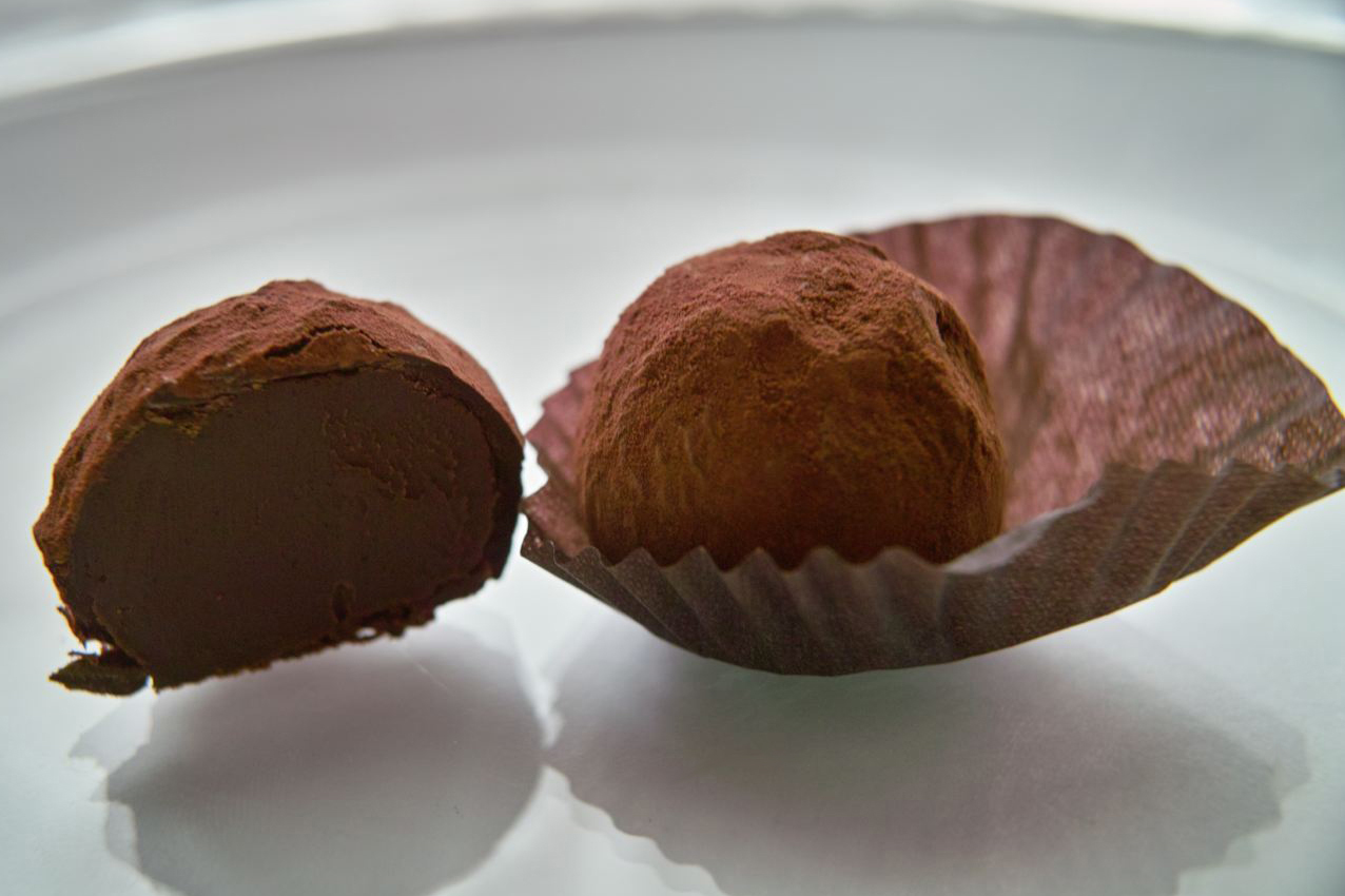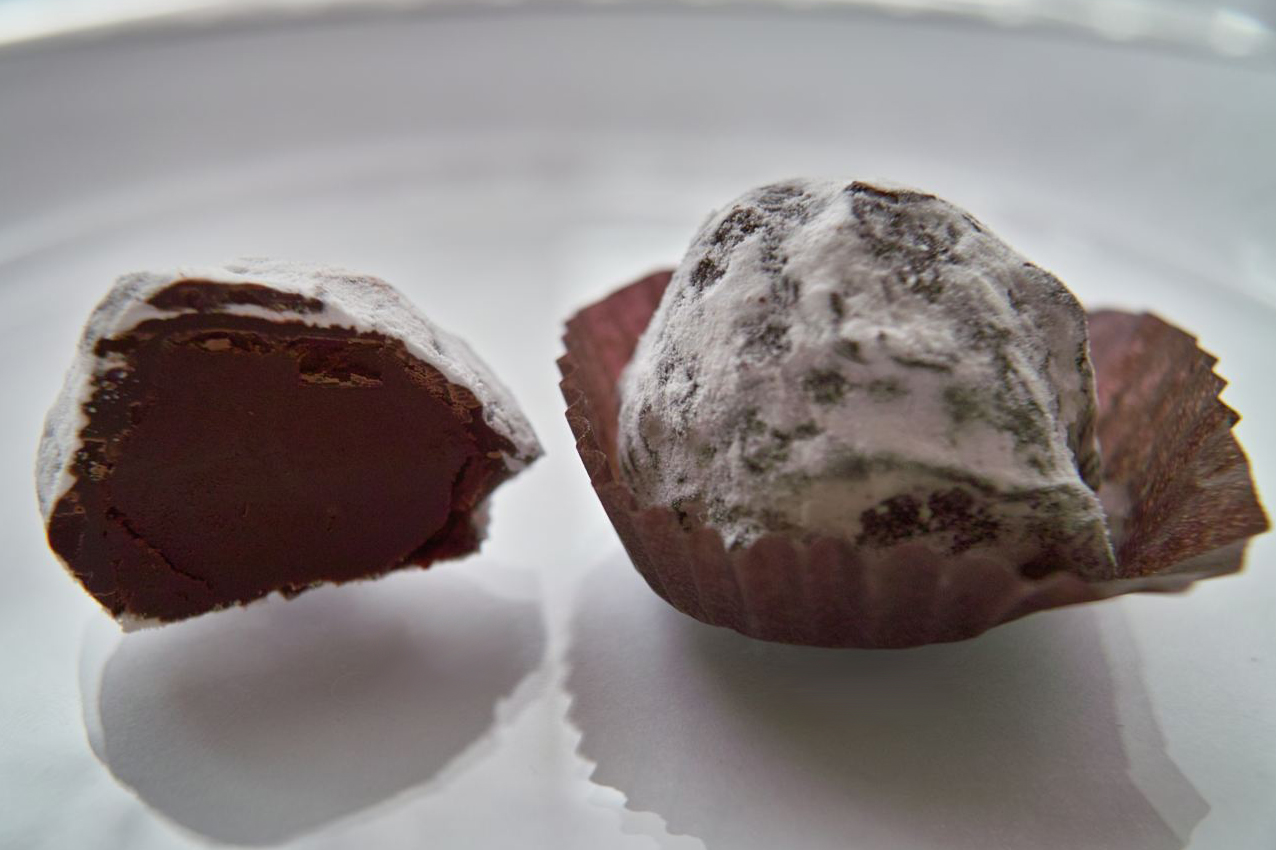 ココアパウダーはずっしりと舌に苦いので表面のビターチョコレートが甘く感じます。中のガナッシュは甘さを抑えたものですが、バニラのフレーバーがとても心地よく鼻に抜けていきます。