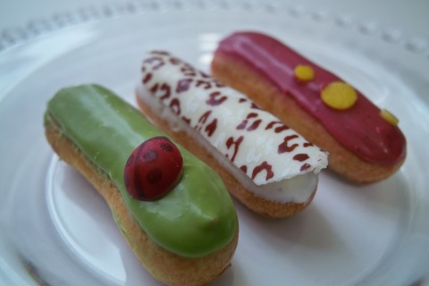 まず、テントウ虫が乗っかっている緑色のは、エクレール コクシフツール(coccinelle)。テントウ虫はホワイトチョコレートでした。塩味が効いたエクレアで、中はオレンジクリームかな?緑色のクリームはフローラルな香りがしたけど、何の味かちょっとわかりませんでした。色のインパクトが味覚を混乱させています(汗
