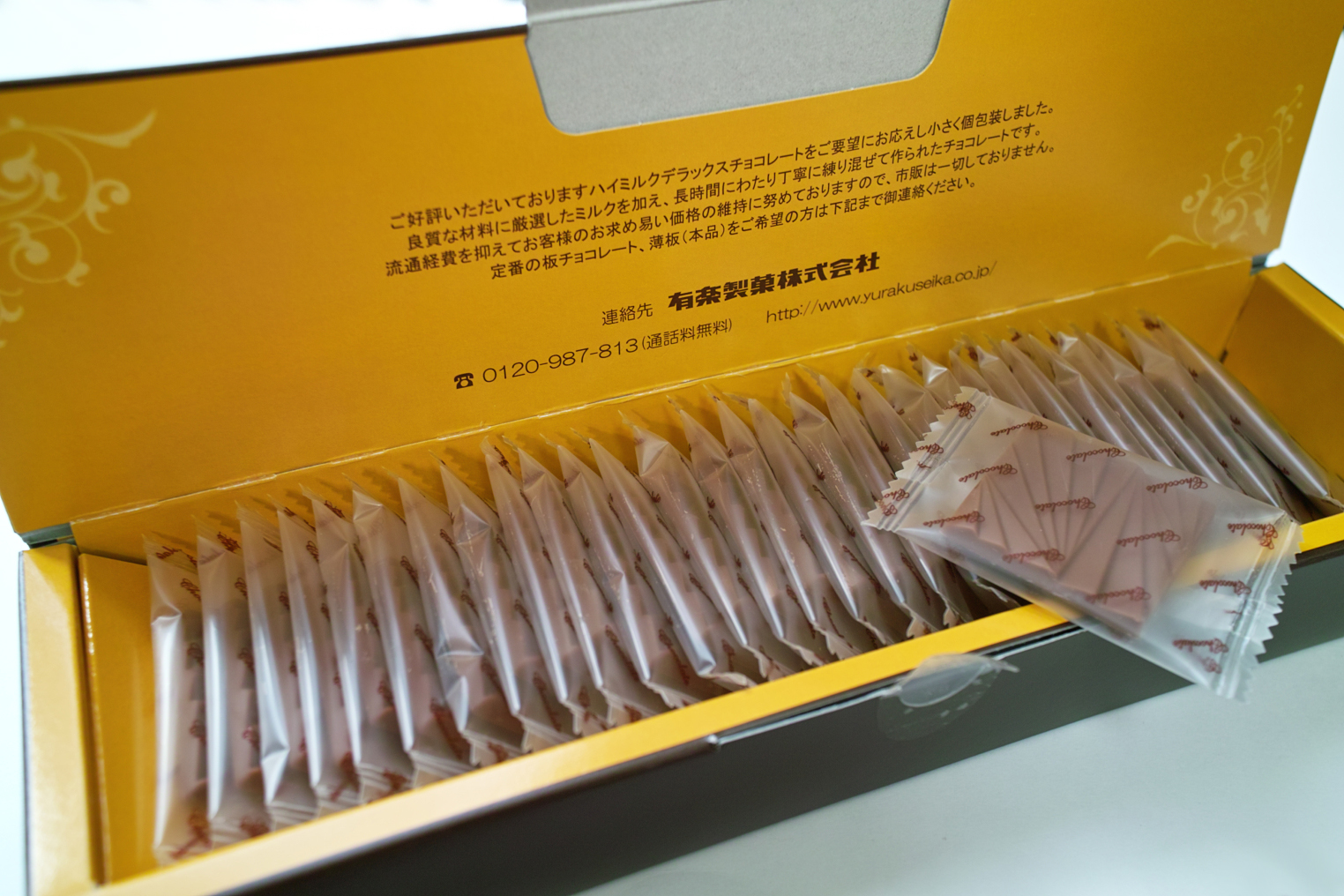 ハイミルクデラックスチョコレートは有楽製菓の工場直販に限られ、市販されません。入手は、工場の窓口で直接買うか、ペリカン便代金引換で購入するかの二通りです。詳しくは有楽製菓のホームページでどうぞ。